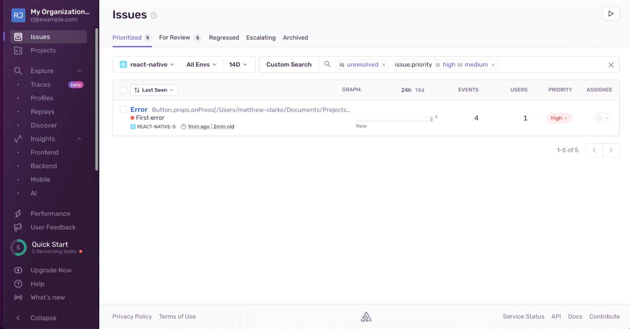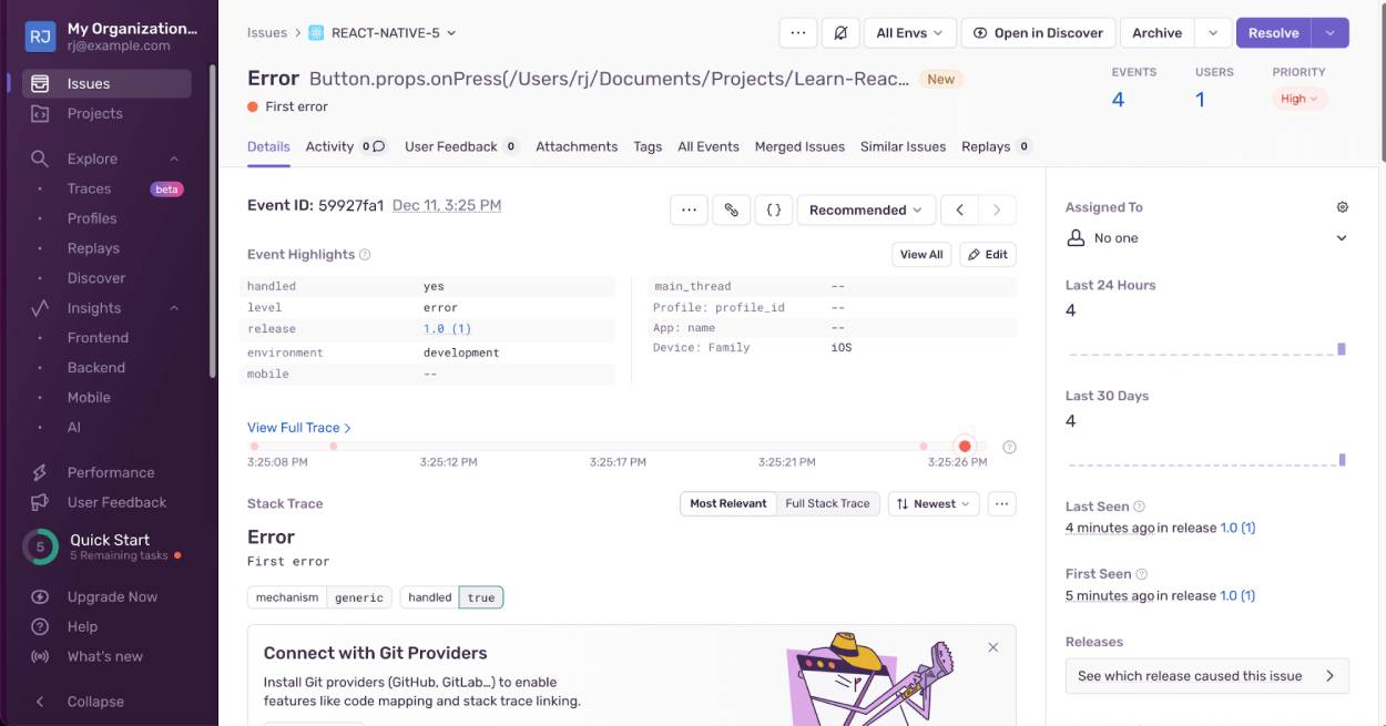 In this guide, you’ll learn how to create and view logs in React Native and how to create and save custom logs to a file. We’ll focus on JavaScript logs. We’ll also show you how to go beyond traditional logging using Sentry’s React Native SDK, which allows you to automatically report errors and exceptions to Sentry’s cloud service and view events that lead up to the error.