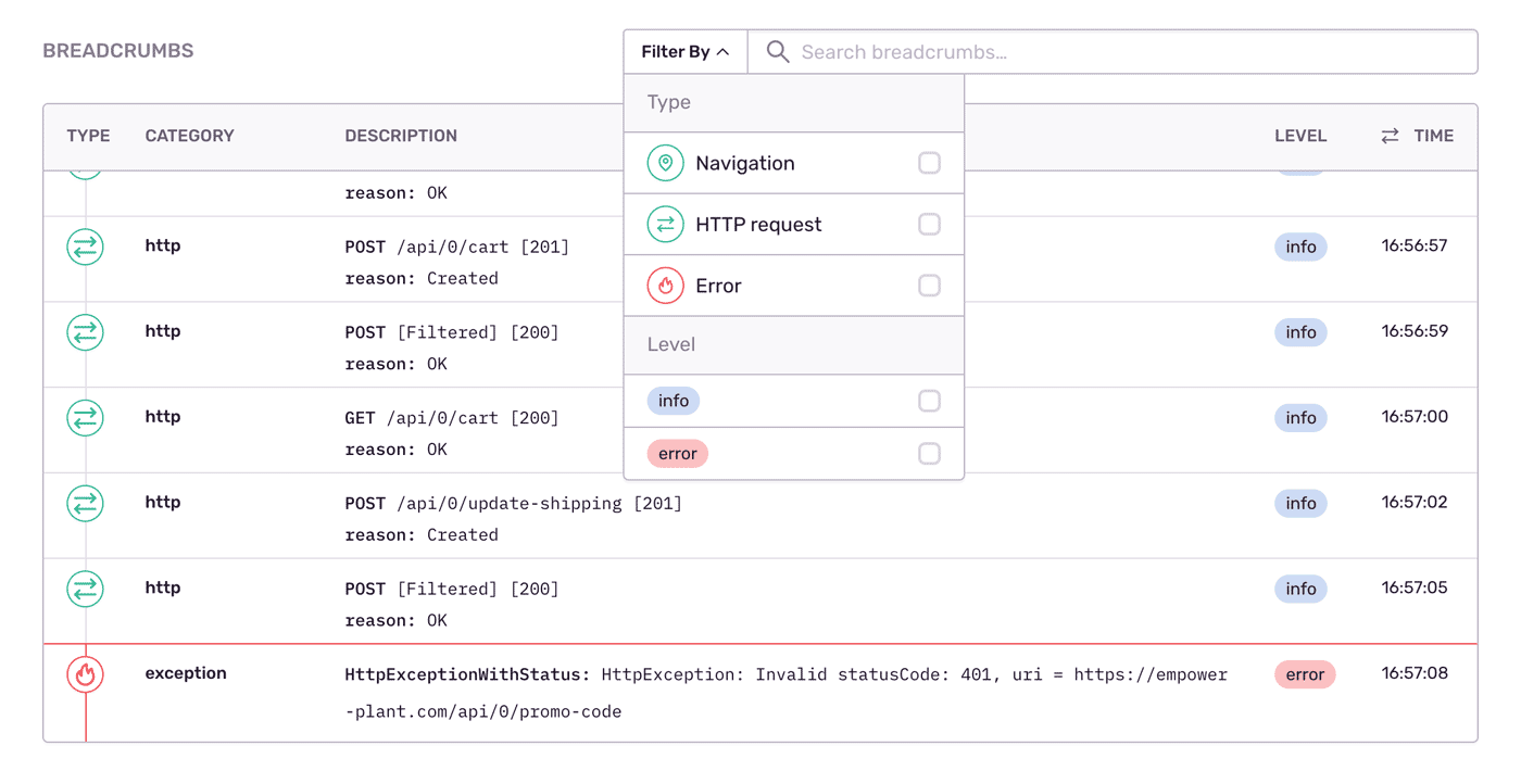 Here, we turn to error and crash reporting. And if you are developing on the Flutter platform, we just added support so your team can monitor Dart/Flutter and Native SDKs. You can follow a user’s trail using breadcrumbs, UI events, and HTTP requests to see if they are engaged. Any errors you find are automatically symbolicated. If a crash occurs when a user’s device goes offline or a fatal crash occurs, Sentry also provides offline caching so that you don’t miss any critical error reports.