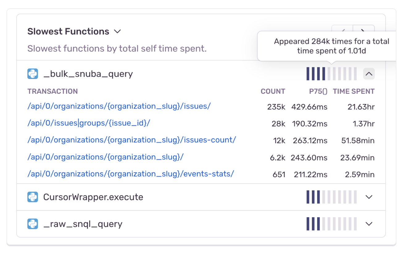 With this expanded SDK support, we’ve added a pair of new widgets that provide a quick look at areas of your code that may be ripe for performance enhancements. The Slowest Functions widget meticulously compiles and ranks your application's slowest functions based on their cumulative self-time (amount of time it takes a function to execute, excluding other functions it calls). The Most Regressed Functions widget shines a spotlight on the functions within your codebase that have experienced the most substantial regressions in terms of self-time, over a defined time period. The widget's breakpoint detection algorithm identifies the precise moment when these regressions began, allowing you to trace back to the specific software release that introduced the regression. Read the recent blog post to learn more.