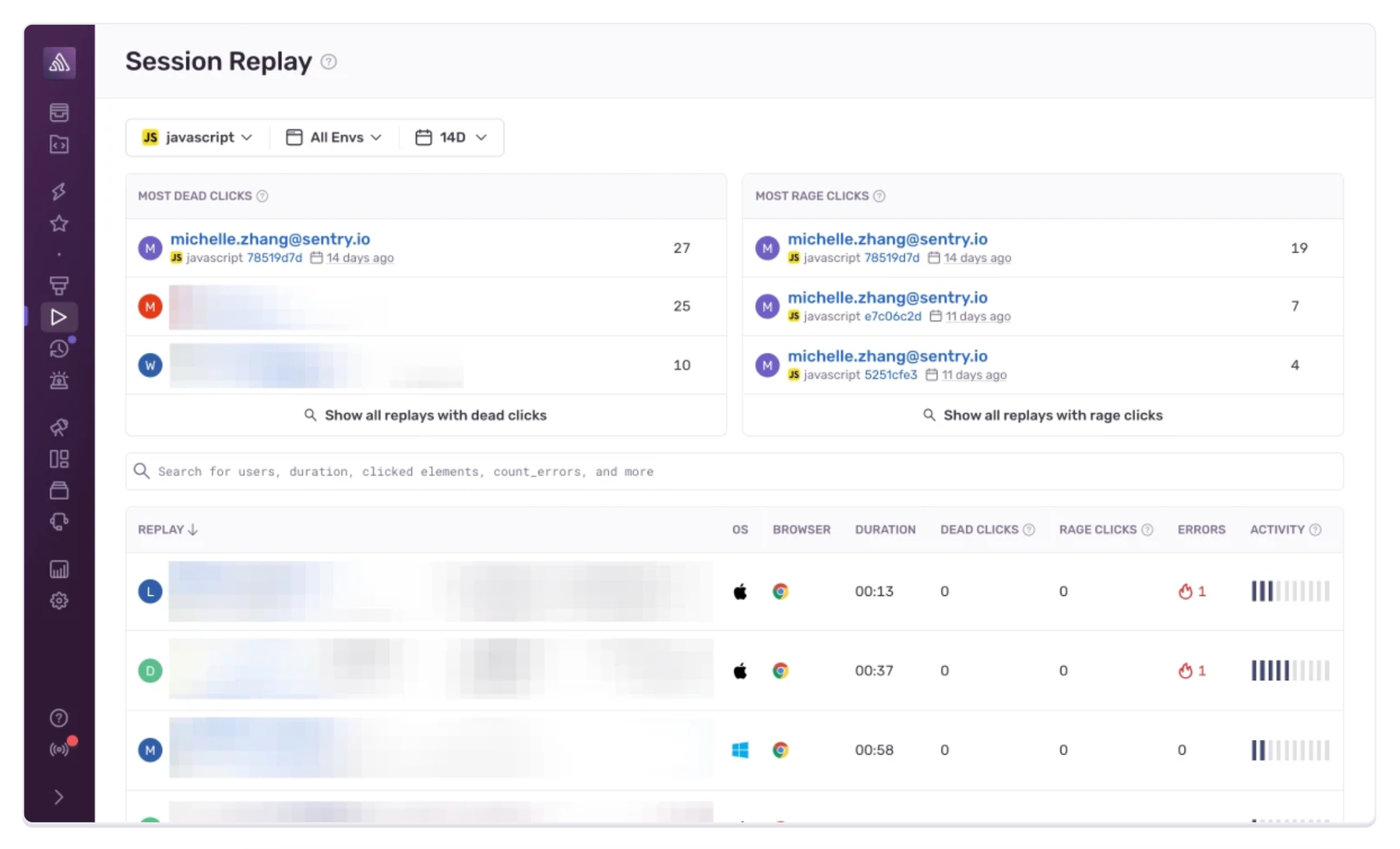The fallout from malfunctioning frontend features, like buttons, extends beyond mere technical glitches; it can frustrate your users and lead them to doubt the overall reliability of your application. Two telltale signs of someone being frustrated are rage clicks, a series of rapid and agitated clicks on the same unresponsive element, and dead clicks, instances where users click on seemingly interactive elements, only to be met with an absence of any obvious action or change in the application. Being able to easily identify this user frustration and rapidly pinpoint the underlying cause is critical for you to keep your users happy.