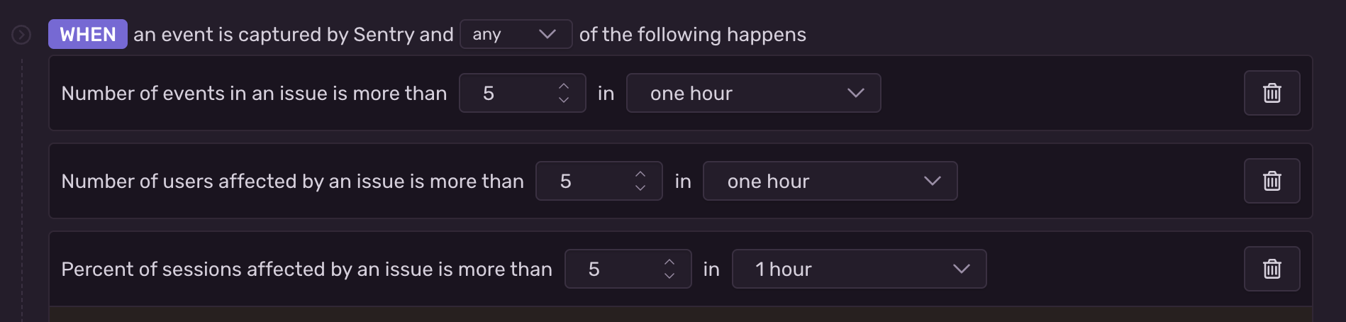 We validate each event ingested for a project against its issue alert rules. For example, if the rule has a condition “Number of events in an issue is more than 5 in an hour,” we query Snuba for the number of events in the last hour to see whether or not the condition has been met. If the condition has been met, then the alert fires.