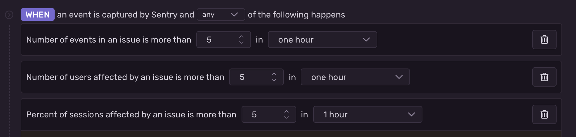We validate each event ingested for a project against its issue alert rules. For example, if the rule has a condition “Number of events in an issue is more than 5 in an hour,” we query Snuba for the number of events in the last hour to see whether or not the condition has been met. If the condition has been met, then the alert fires.