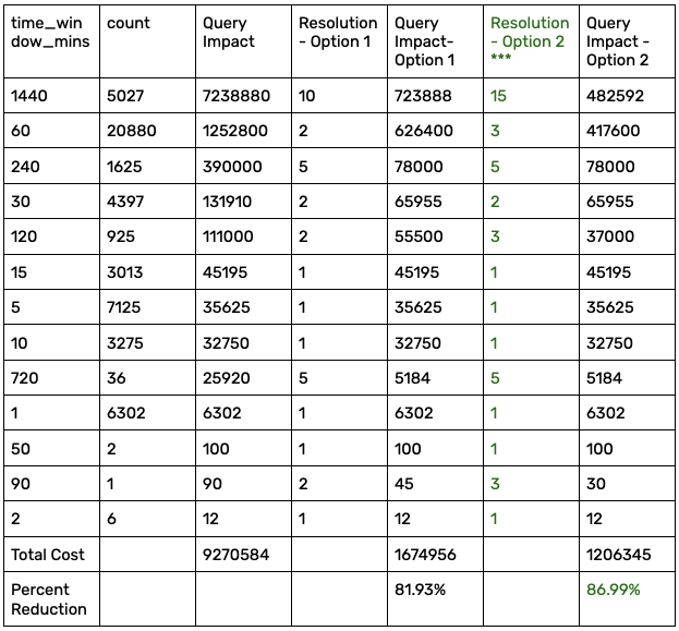 With this theory in mind, we put together the chart below, mapping the time_window to the frequency of Snuba subscription updates (resolution).