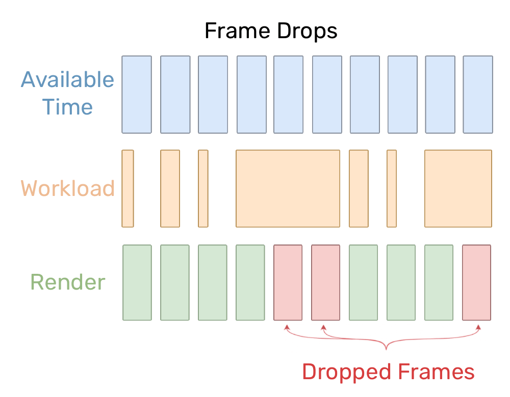 To correct the timing the system skips the frames that should already have been rendered at this point in time (the dropped frames). This correction behavior is commonly known as frame drops and has the undesired side effect of intermittent frame rate changes that can be noticed as visual stutters (i.e. not scrolling smoothly).