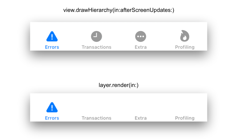 During testing we noticed that the rendering using layer.render(in:) is incomplete, in particular the icons used in the tab bar did not show up in the rendered screenshot at all.