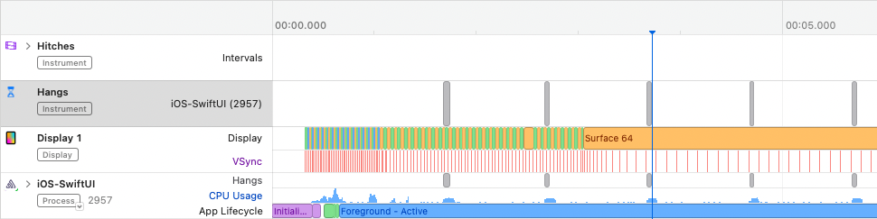 Using Xcode Instruments on our Sentry Apple SDK sample application, we immediately reproduced the reported performance issues and noticed a consistent pattern of main thread hangs every second.