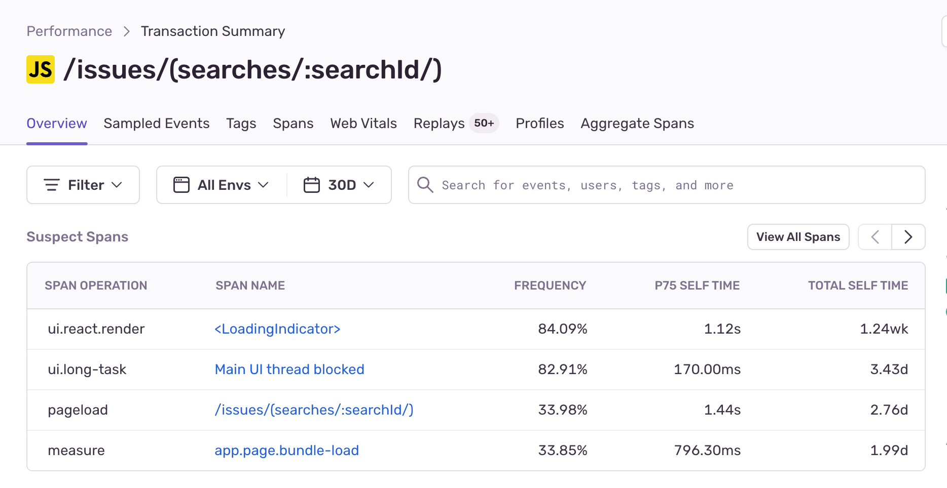 Sentry’s Performance product automatically collects span information during page-load events. A good place to start is by looking at the most commonly collected spans for our most visited page. It's all about prioritization — we want to find the optimizations that will benefit most of our users and tackle those first, instead of chasing smaller optimizations that will have a little impact.