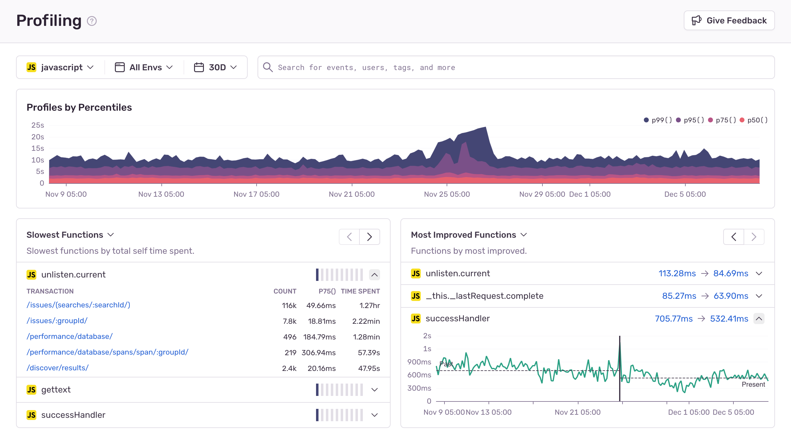 This is just one example of a performance issue that occurs in production with a better workflow. We no longer have to rely on our users to complain about performance issues and can instead use profiling data to be proactive, prioritize performance work, and validate that our changes are indeed improving performance for our users.