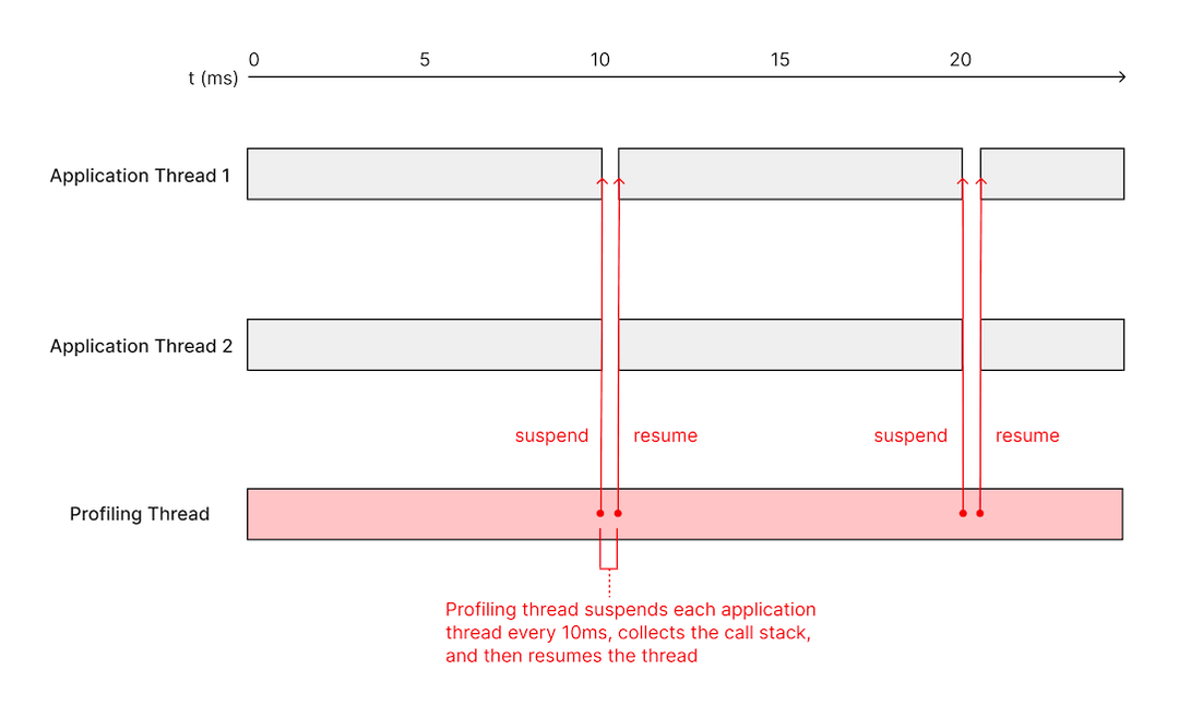 • Sampling profilers collect samples at a fixed interval to limit performance overhead at the cost of only collecting approximate data about function execution that does not have the resolution to determine the duration of all function calls.