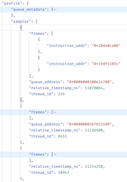 An iOS profile payload is simply a timestamped series of samples (call stacks), grouped by thread ID: