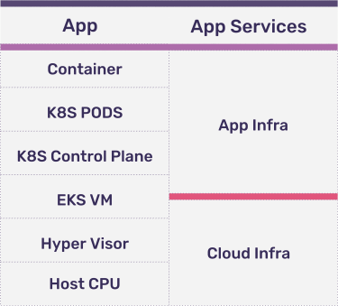If you are running a managed K8S cluster such as Amazon Elastic Kubernetes Service (EKS), it’s generally the cloud provider’s responsibility to maintain the cloud infrastructure layer. However, we have seen cases where the EKS worker node VMs must be monitored and configured for appropriate loads and set with correct auto-scale parameters, so we include part of it in our app infrastructure layer.