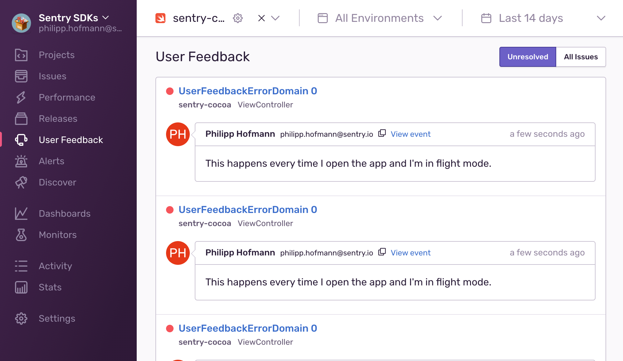 To see your user's feedback, you can navigate to User Feedback on the left side of your menu. This displays all the feedback for your current selected project or all projects in your organization.