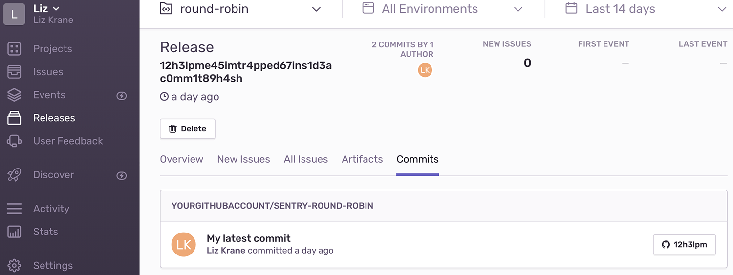 If your new build succeeded, log into your Sentry account and take a look at your project's "Releases" page. You should see a brand new release listed for your project, listing the SHA of your latest commit: