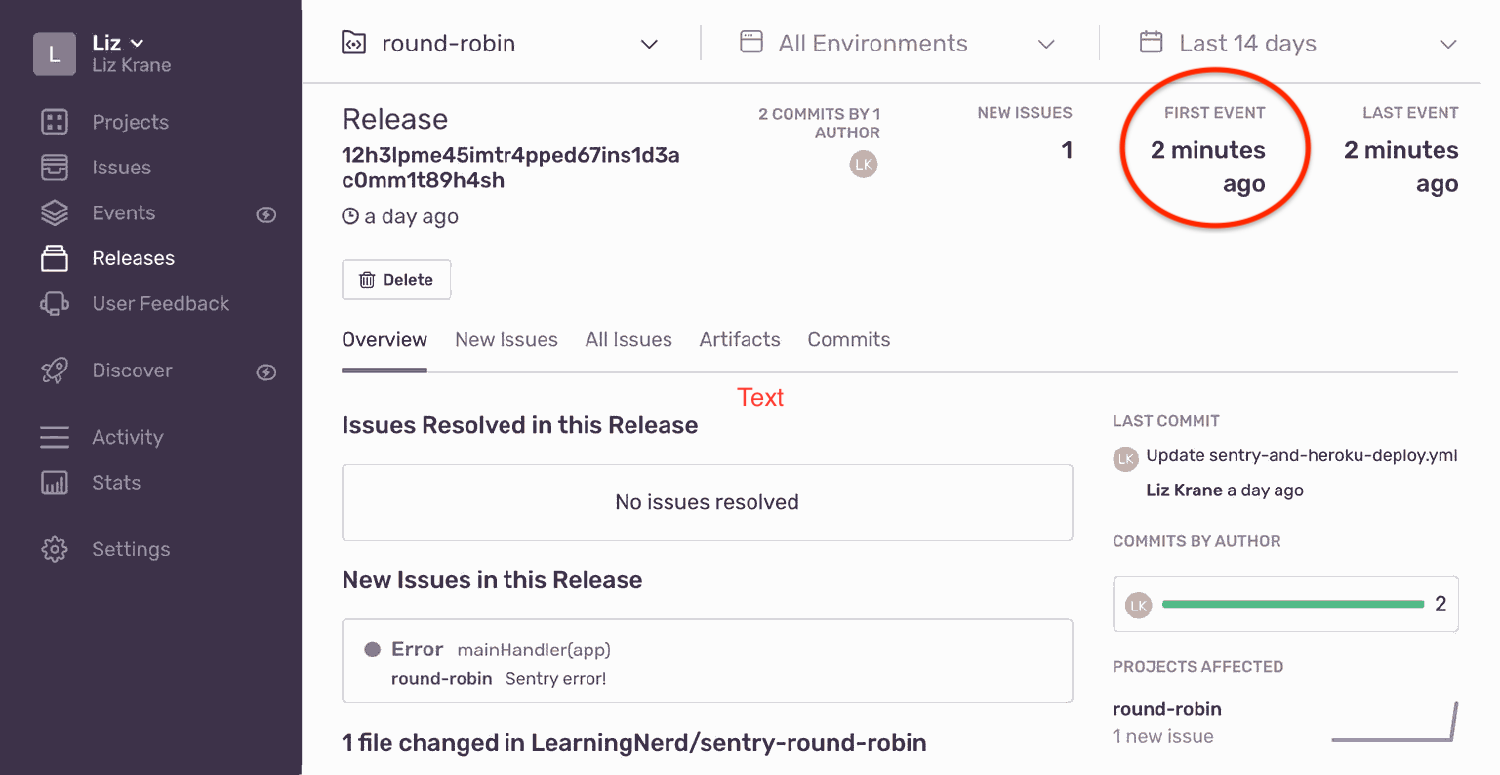 Next, you can use the Sentry CLI to send an event for your project to confirm that new events will be correctly associated with the latest release. If you run this from within your project's Git repository, the current release will be linked to the event automatically: