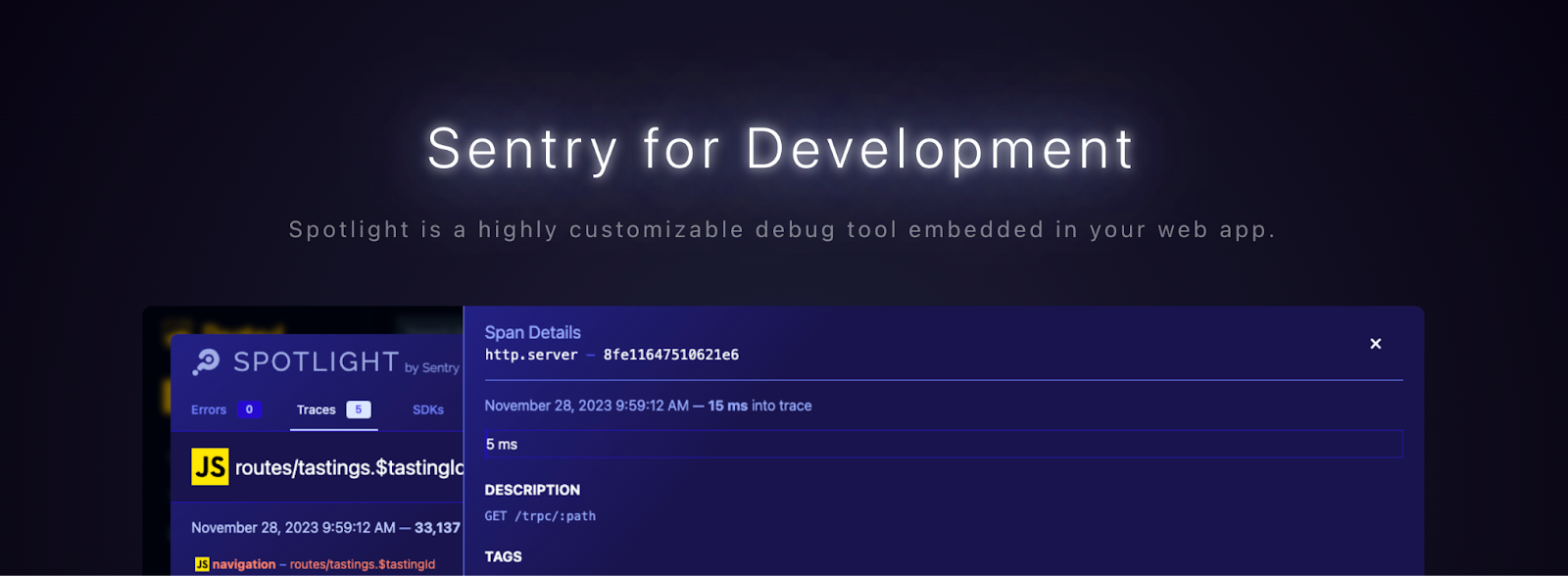 Spotlight takes Sentry's existing SDKs, leveraging the telemetry we've spent 15 years evolving, and brings that telemetry to your local development environment. You can see errors and other signals in real-time as you test out your web app. We launched Spotlight in collaboration with Astro, where we built a first-class experience on top of Astro 4.0’s new Dev Toolbar.