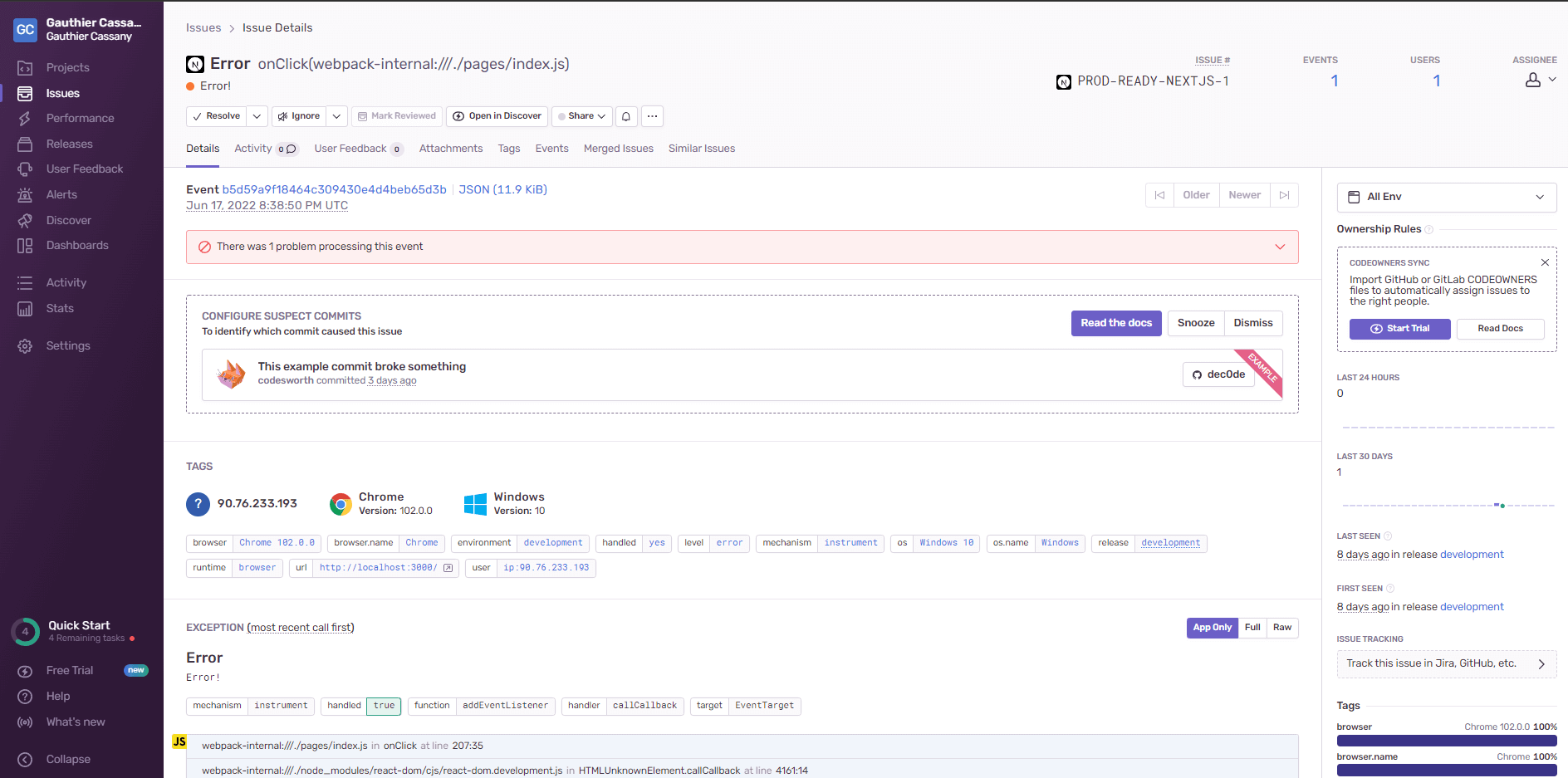 module.exports = withSentryConfig(moduleExports, sentryWebpackPluginOptions);We can already test our implementation by starting our application: