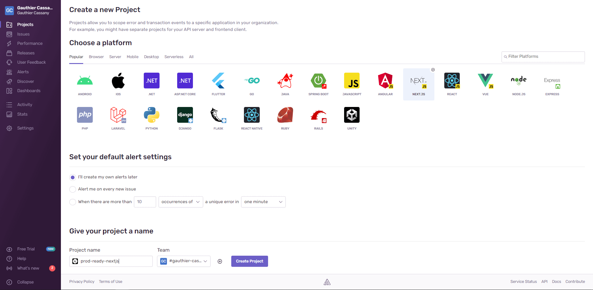 First things first – we need to create a Sentry account, and by creating a new Next.js project: