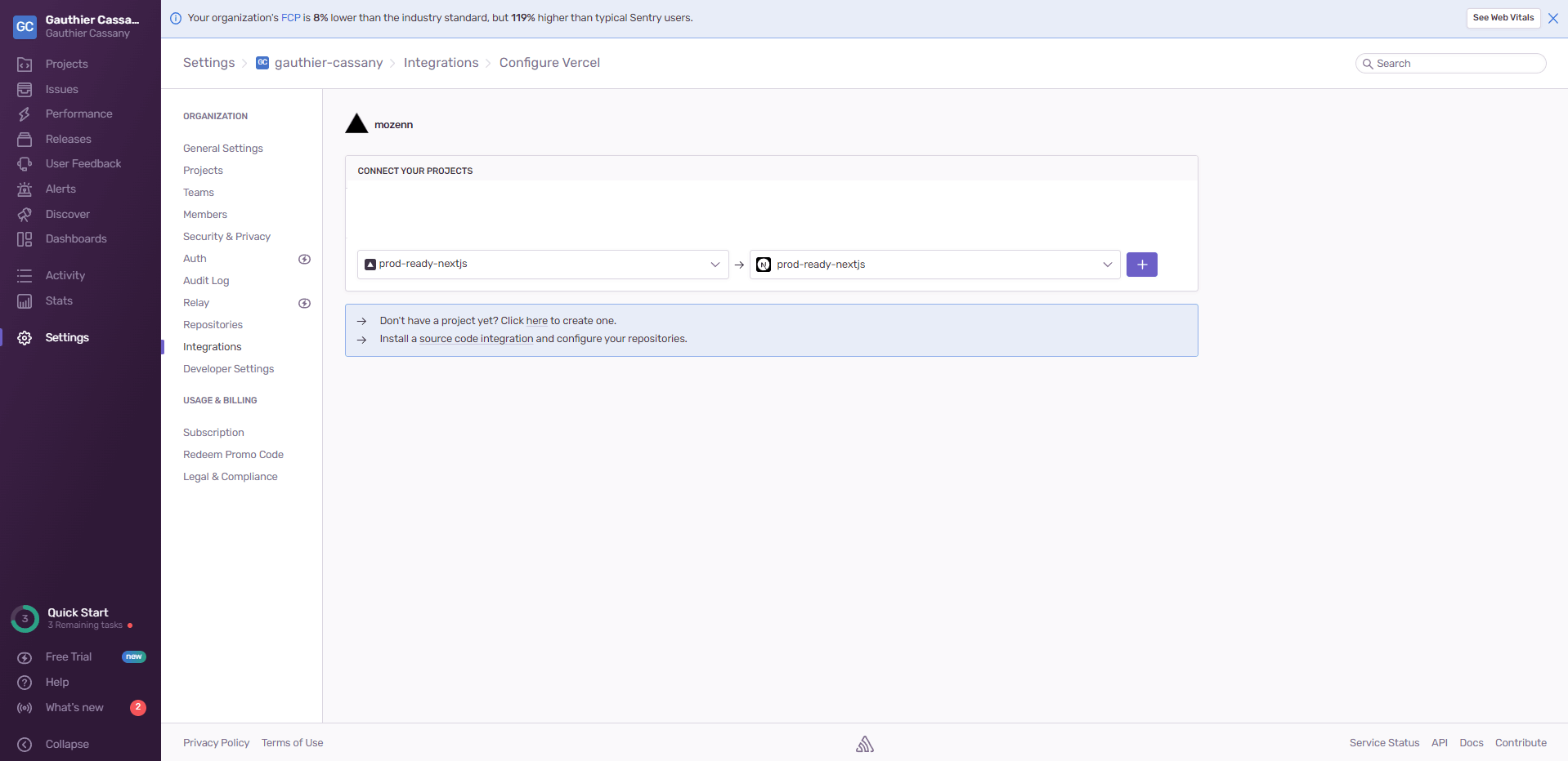 Going back to Sentry, we need to connect the Sentry project to the Vercel project in the Settings menu.