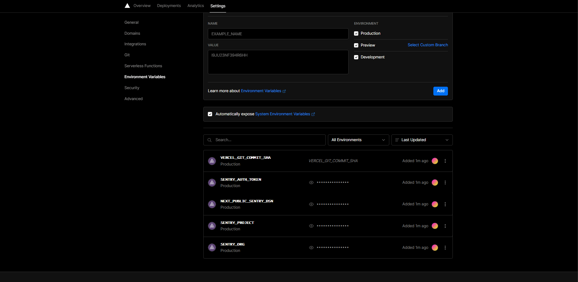 Once the Integration is done, we can see that our Vercel project has picked up the Sentry configuration in the project environment variables.