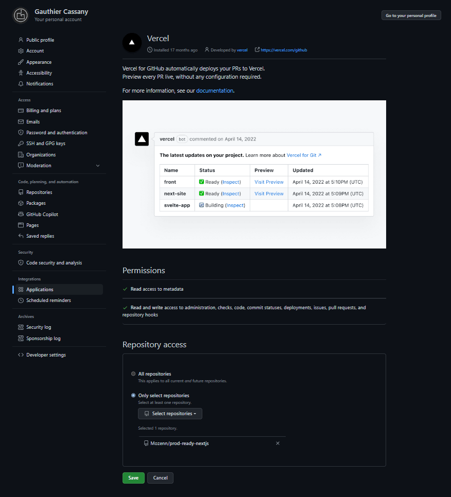 We then need to link our Github account so that Vercel can get access to it.