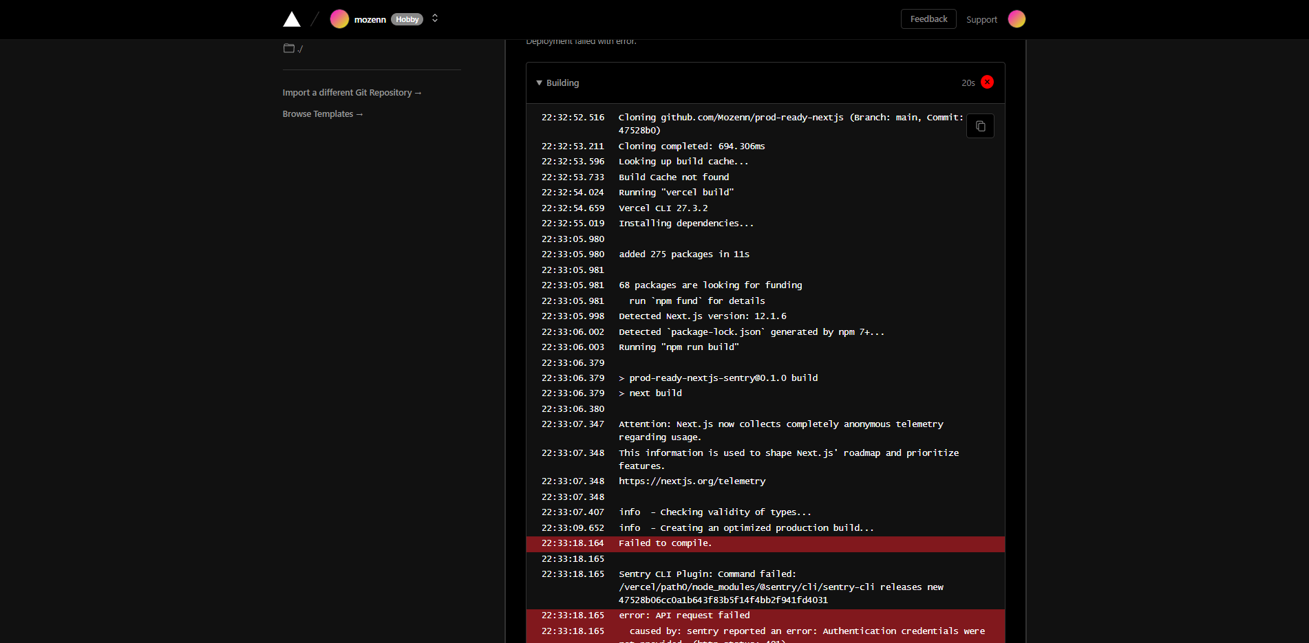 By analyzing the error, we can see that the deployment has failed because the Sentry configuration is missing.