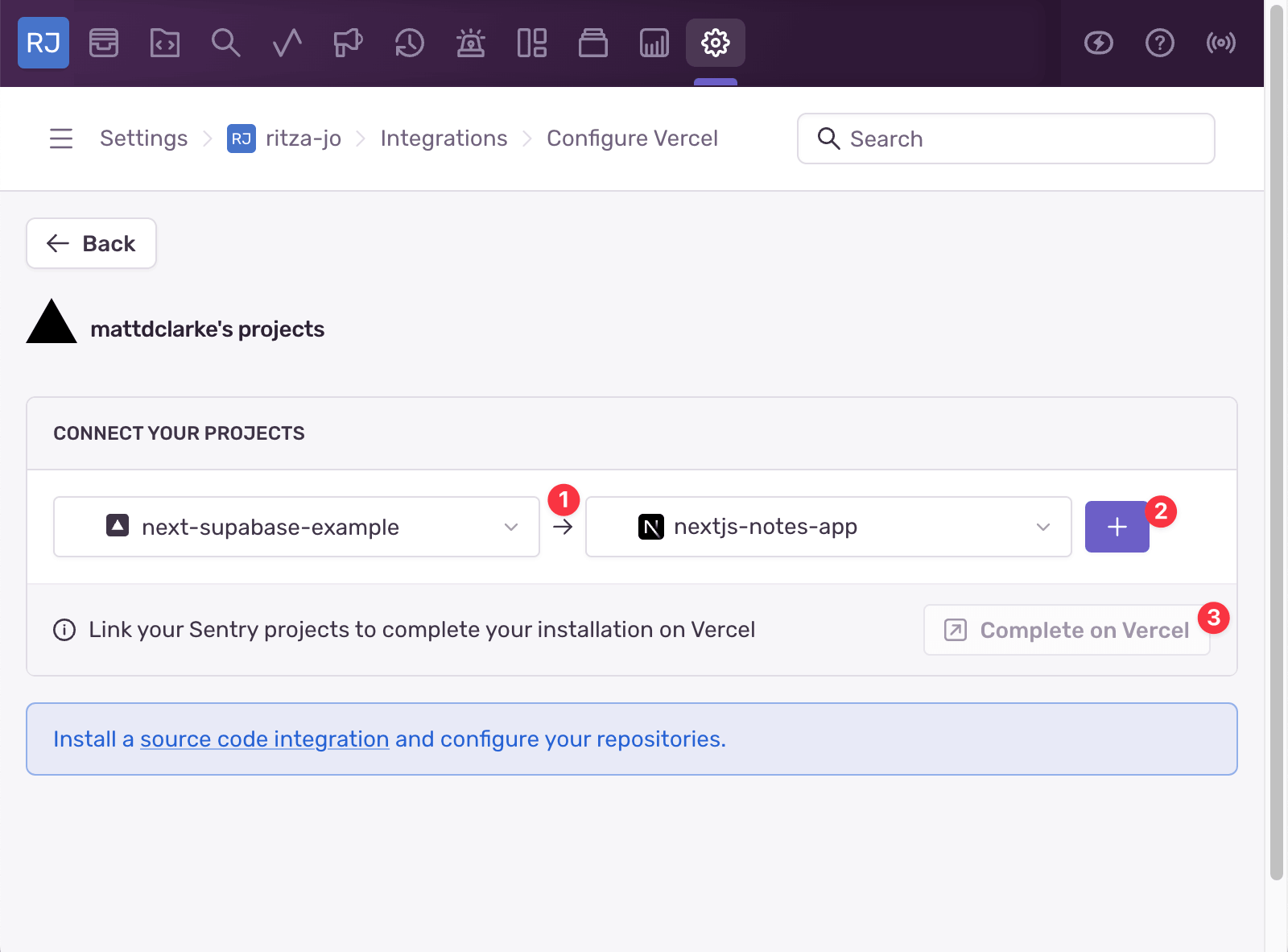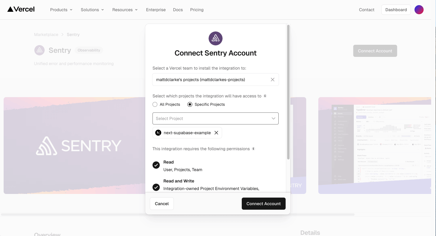 To install the Sentry integration on Vercel, click the Connect Account button: