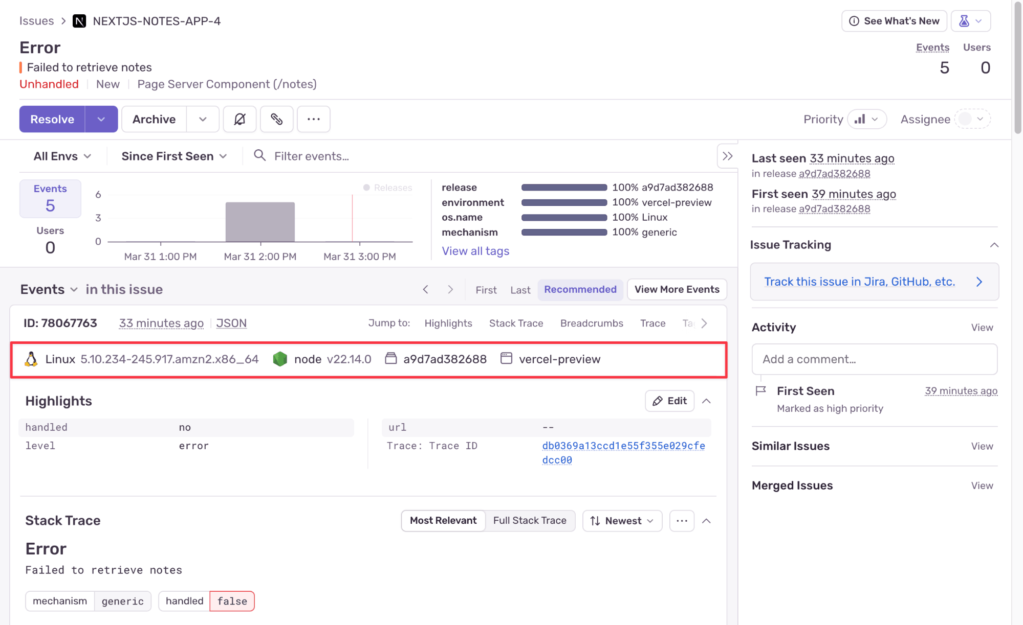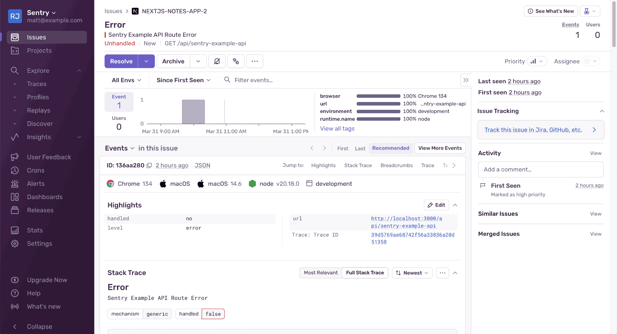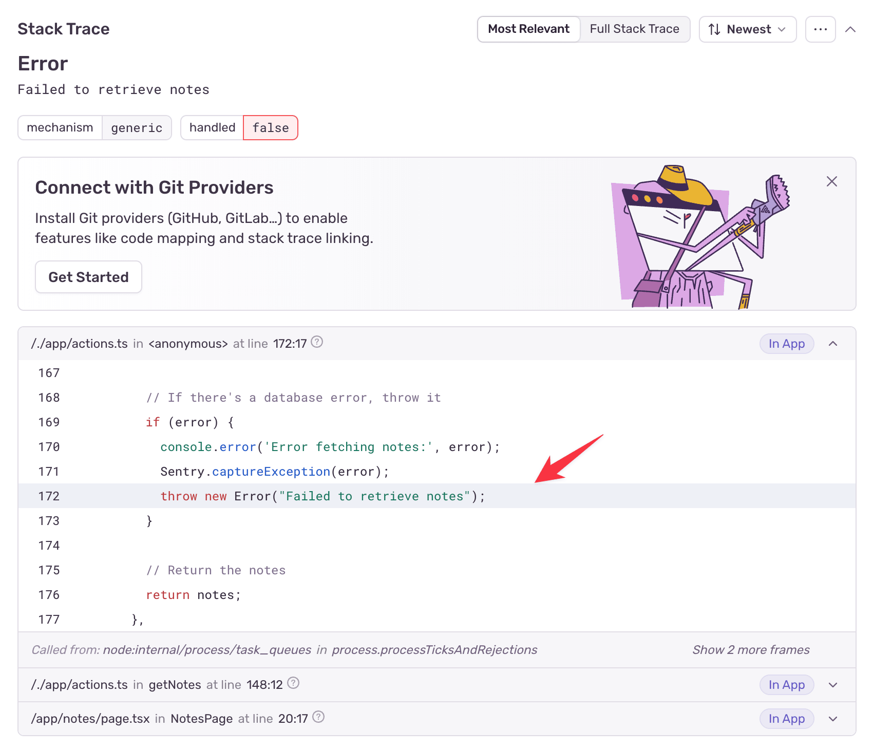 Let’s investigate the “Failed to retrieve notes” error using Sentry. Open the issue in your Sentry dashboard to see details about the error: