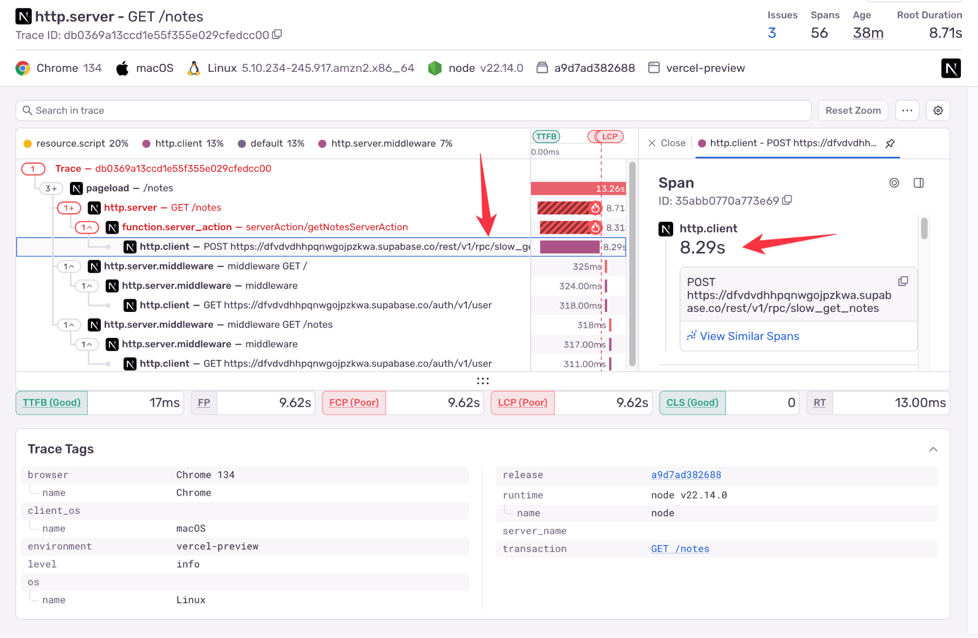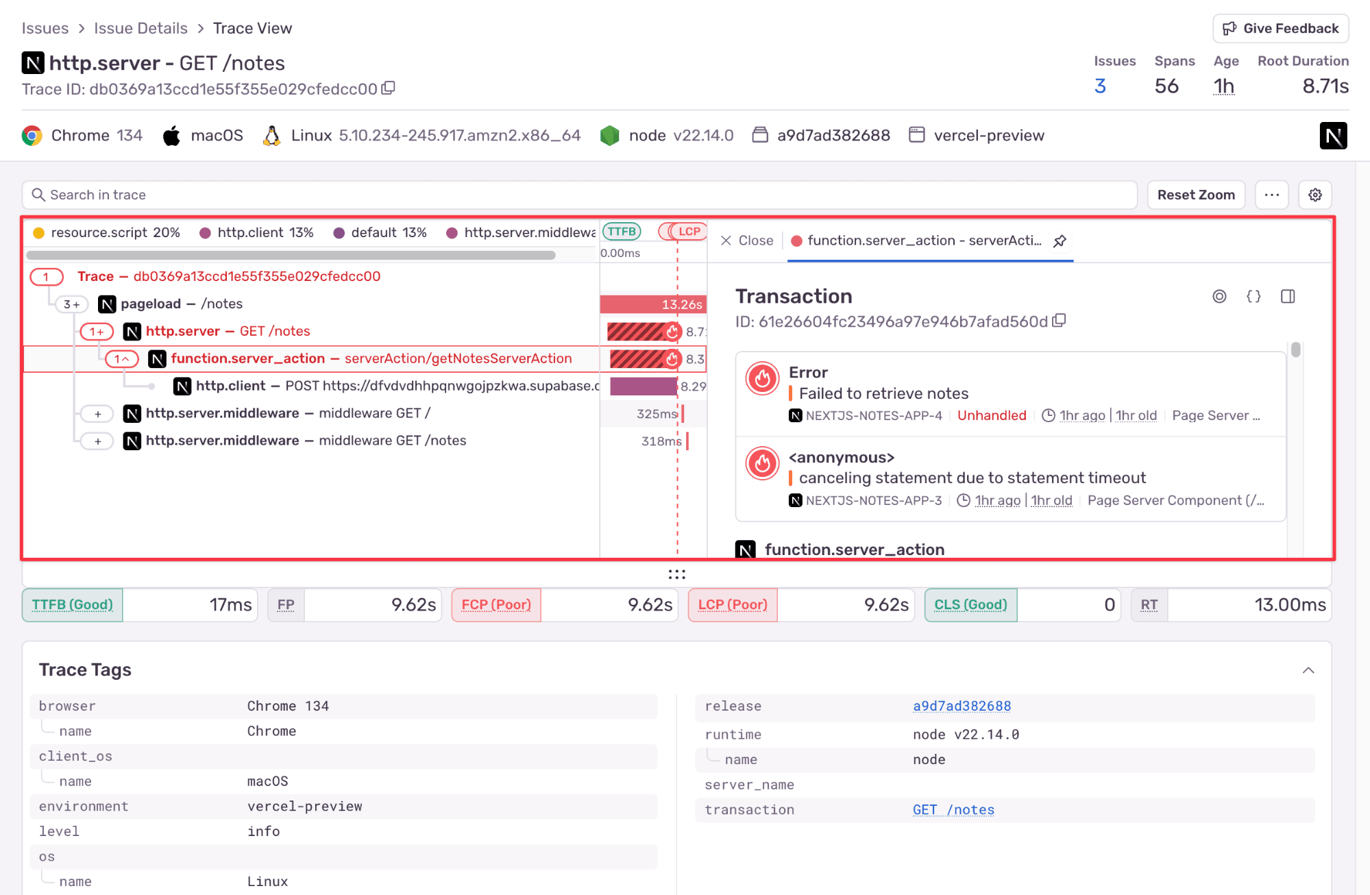 In this post we’ll break down a stubborn timeout in a Vercel-deployed Next.js notes app that leans on Server Actions for moving data. With Sentry’s Trace View, each step shows up like breadcrumb arrows you can actually follow. This allows you to quickly and effectively debug the issue, getting you right back into building instead.