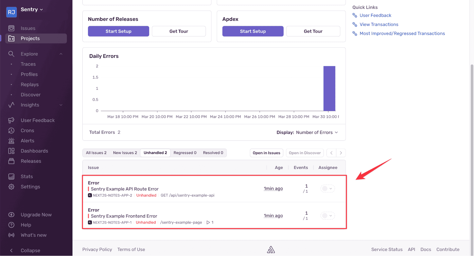 Click the Throw Sample Error button and then open your project in the Sentry dashboard. You’ll see the two example errors as Sentry issues: