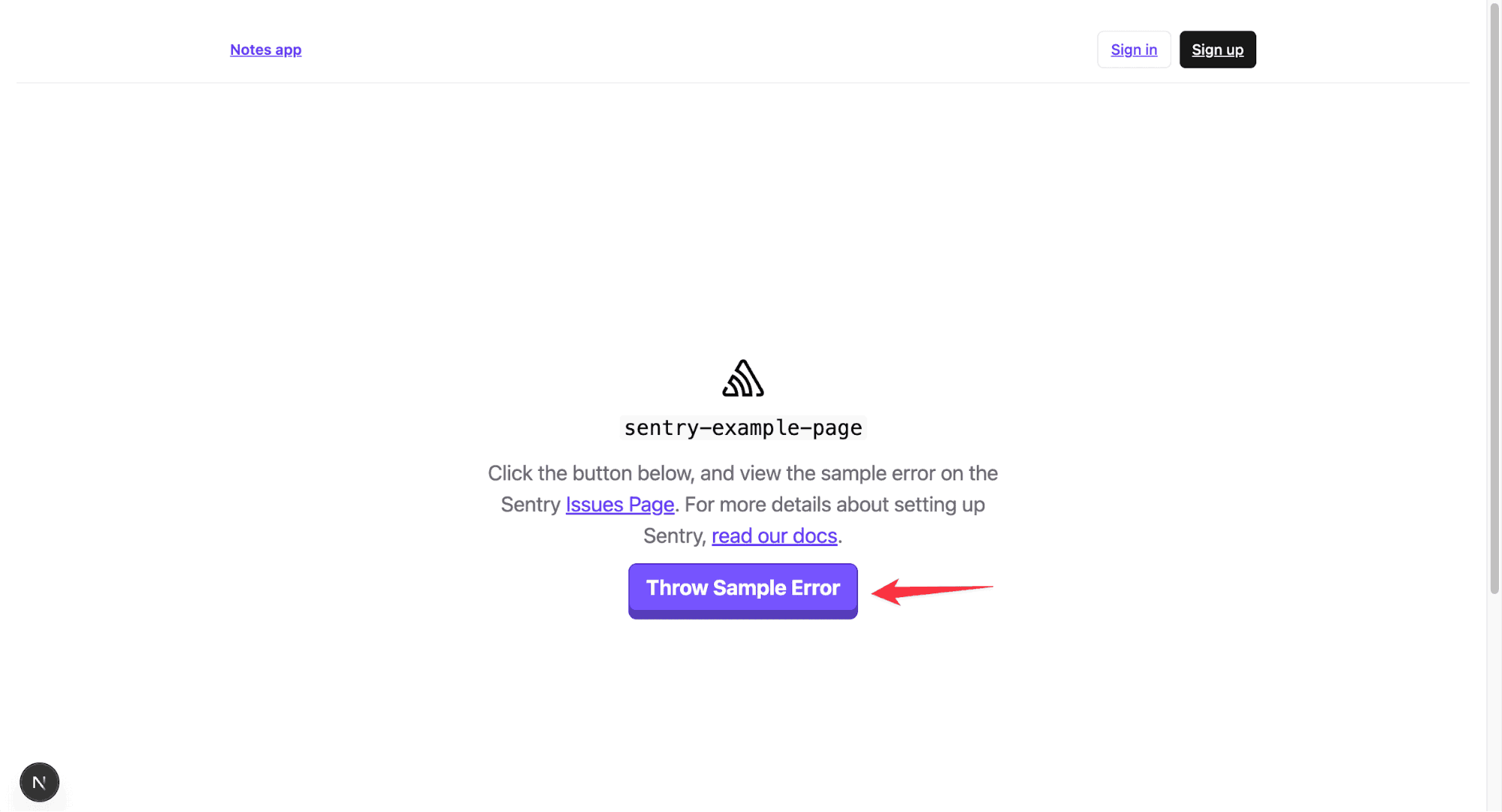npm run devThen visit the /sentry-example-page route in your browser. For most Next.js applications, this will be at localhost.