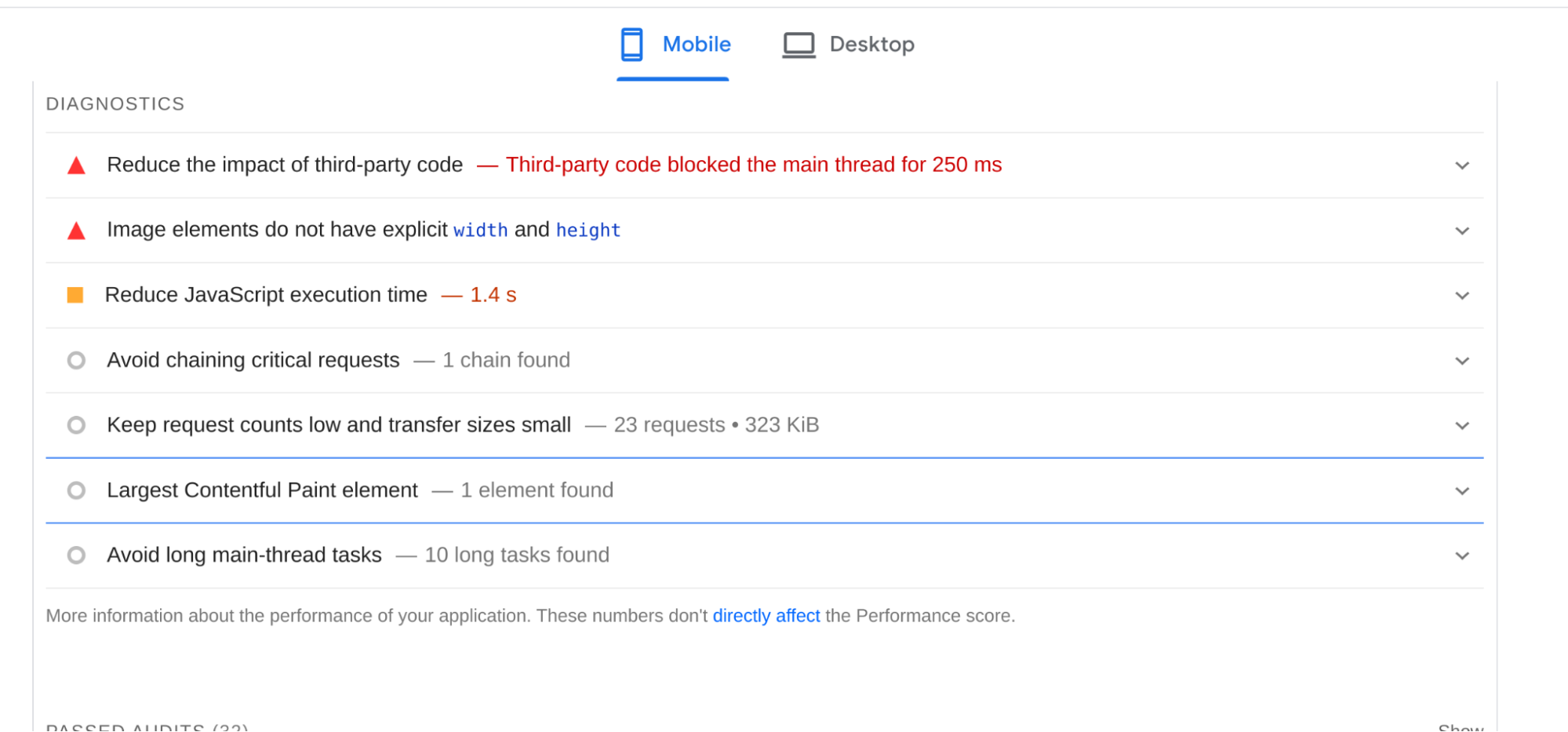 The first step in any site optimization process is to get a benchmark of the speed of your Django website. Google page insights is the right tool to measure website performance as it reveals a website's health by providing insights on how the website performs on mobile and desktop devices, and will give you a performance score based on the following metrics.