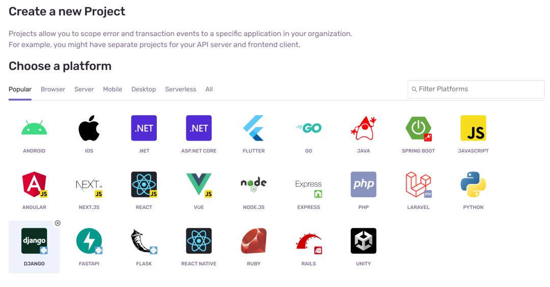 To follow along, set up your Sentry account and create a Django project as shown below: