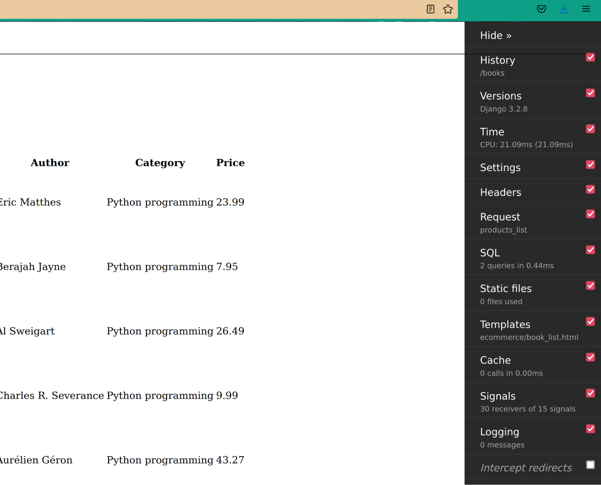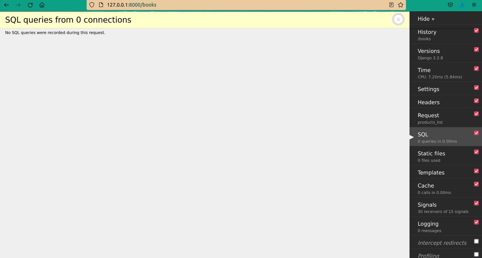 })Navigate to the page which displays the list of books, and you should see that no SQL queries were run since the data is now being fetched from a cache. The view doesn't touch the database hence freeing up the database to perform other critical tasks.