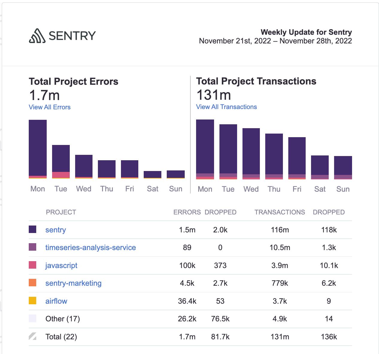 If you’re a Sentry user, you’ve probably seen those weekly emails we send out at the start of the week. They give a weekly recap to users of what happened in Sentry in the past week: