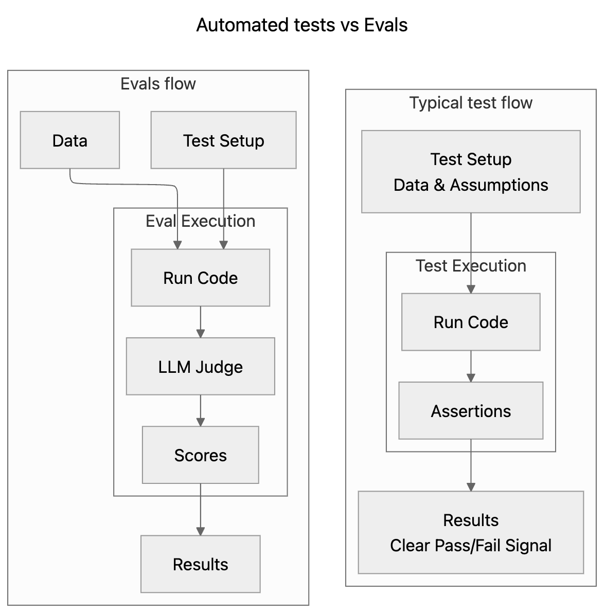 When testing, you set up data and assumptions, run your code, compare results to expectations, and get a clear pass/fail signal. Evals work exactly the same way - they just add some additional layer of scrutiny (such as an LLM judge) between your system output and the final assertion to properly evaluate the non-deterministic nature of AI responses. As a result, unlike conventional testing, you usually do not receive a simple pass/fail, but rather a percentage, confidence assessment, or other metrics.