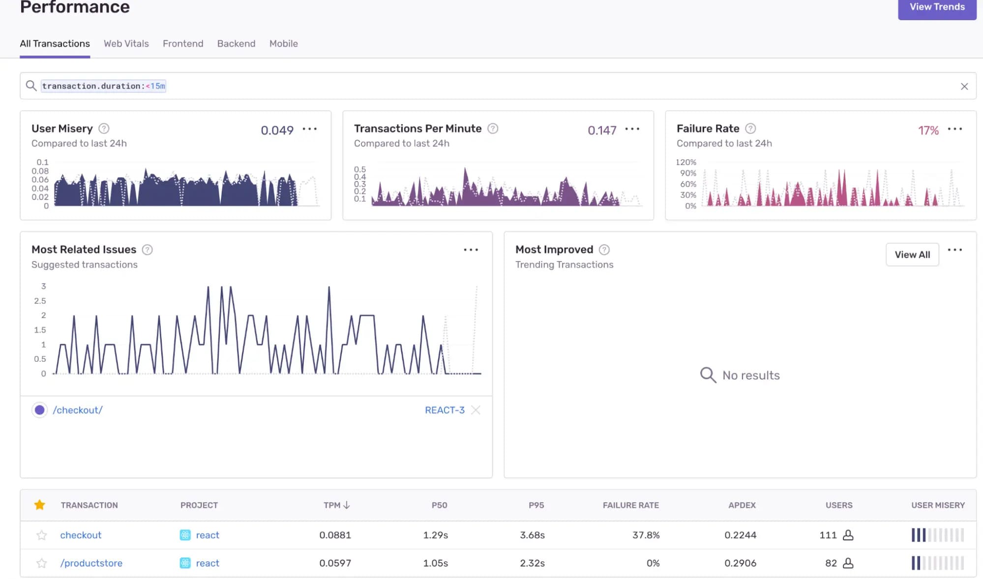 Sentry also monitors performance and highlights each issue’s impact on users, including how exceptions impact application latency. Sentry’s Performance Monitoring features give you insight into the success or failure of transactions and how they impact your users.