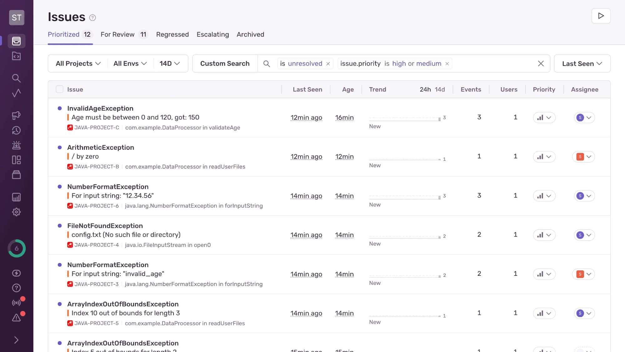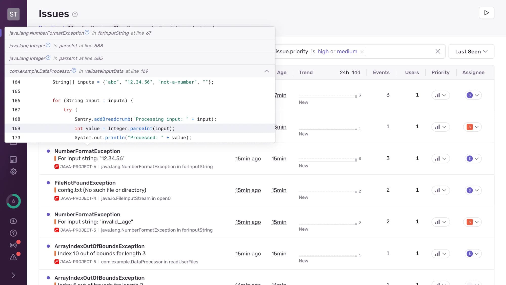 In Java these issues surface as exceptions. The language offers try/catch blocks, finally clauses, and a clear hierarchy of checked and unchecked exceptions. Pair that with Sentry and you get the bigger picture: who was affected, how often it happens, and which commit probably introduced the fault. With that context you can move quickly from “it crashed” to “it’s fixed.”