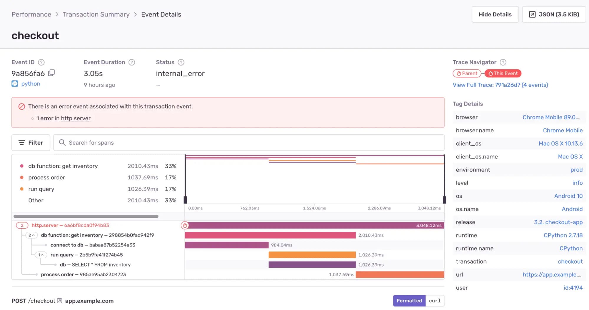 With its distributed tracing methods, Sentry also monitors application performance and highlights each issue’s impact on users, including how exceptions impact application latency. Using Trace View, Sentry provides more extensive information about each exception.