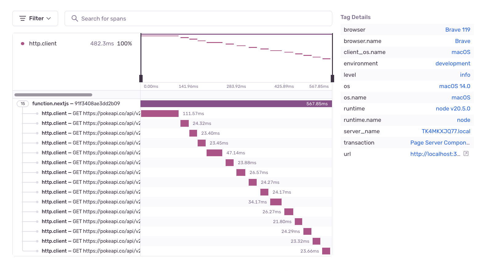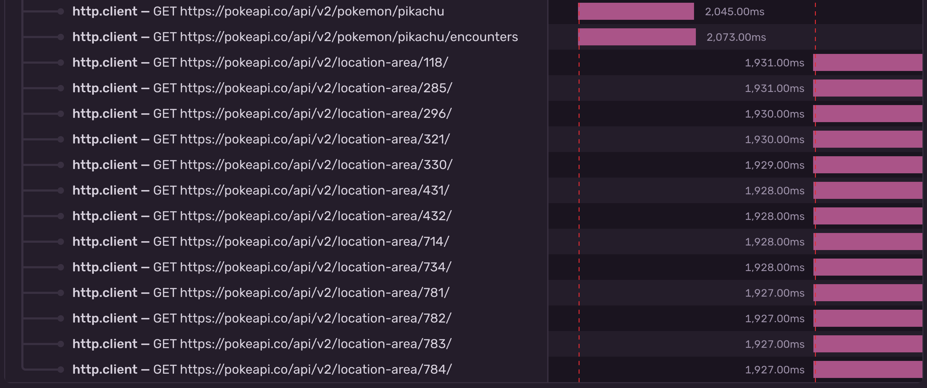 The /pikachu and /pikachu/encounters requests start at the same time, while the /location-area requests depend on the result of the /pikachu/encounters request, but they too start at the same time. We broke out the waterfall.