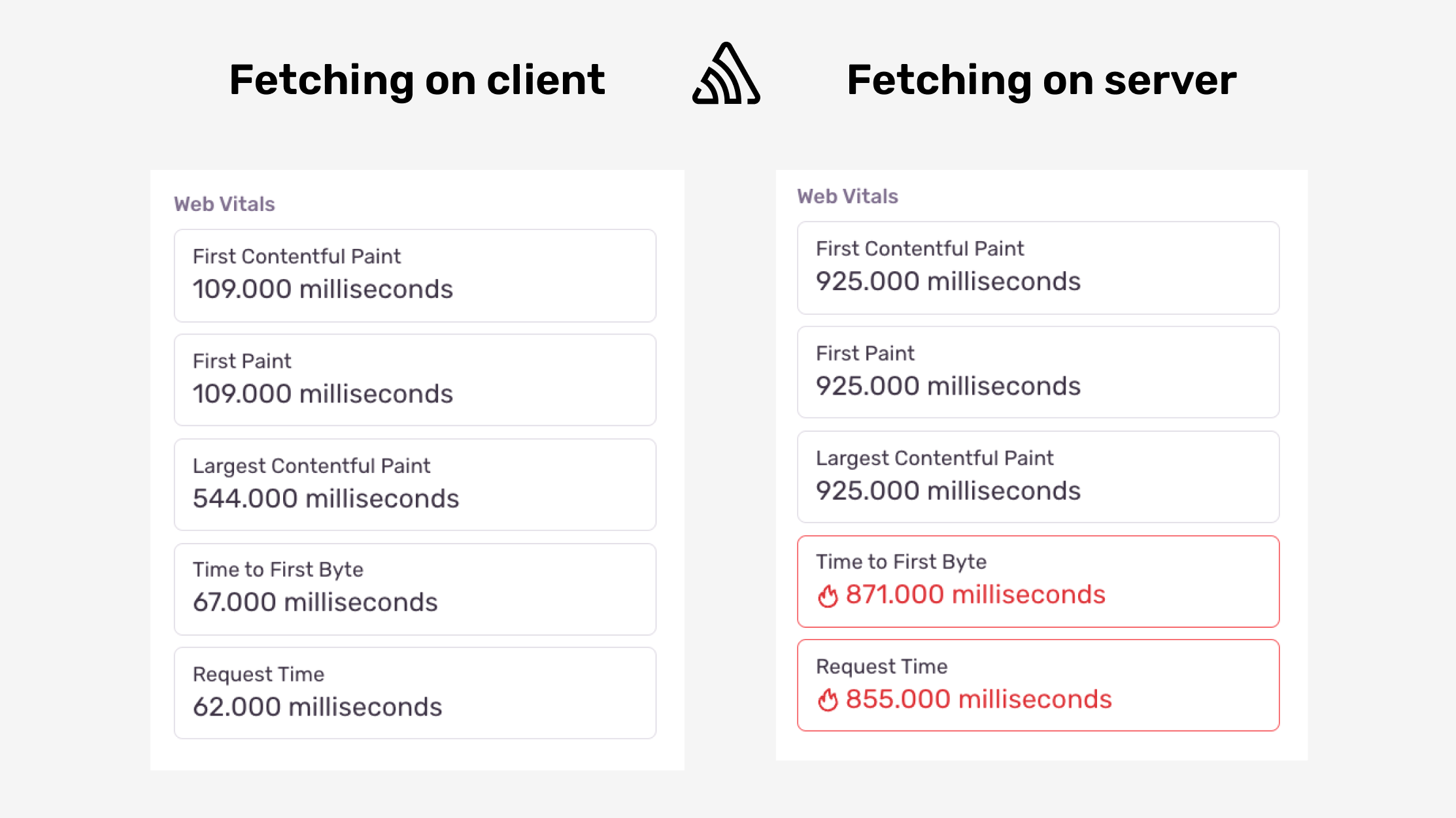 Just moving the data fetching to the server side doesn’t mean that you’ll fix the problem. If you’re await-ing each fetch request individually, you’ll still cause a fetch waterfall, but this time on the server-side. This way the TTFB web vital also suffers because the client needs to wait for the server to do all the data fetching before it starts to draw pixels. So not only you didn’t fix the problem, you introduced a new one.