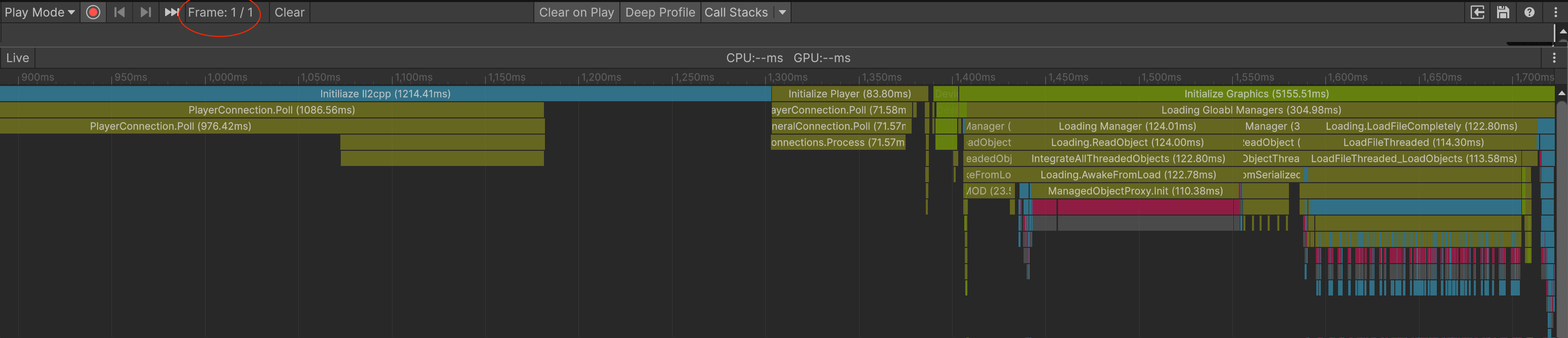 Unity takes time to init itself - and all of this happens in the first frame!