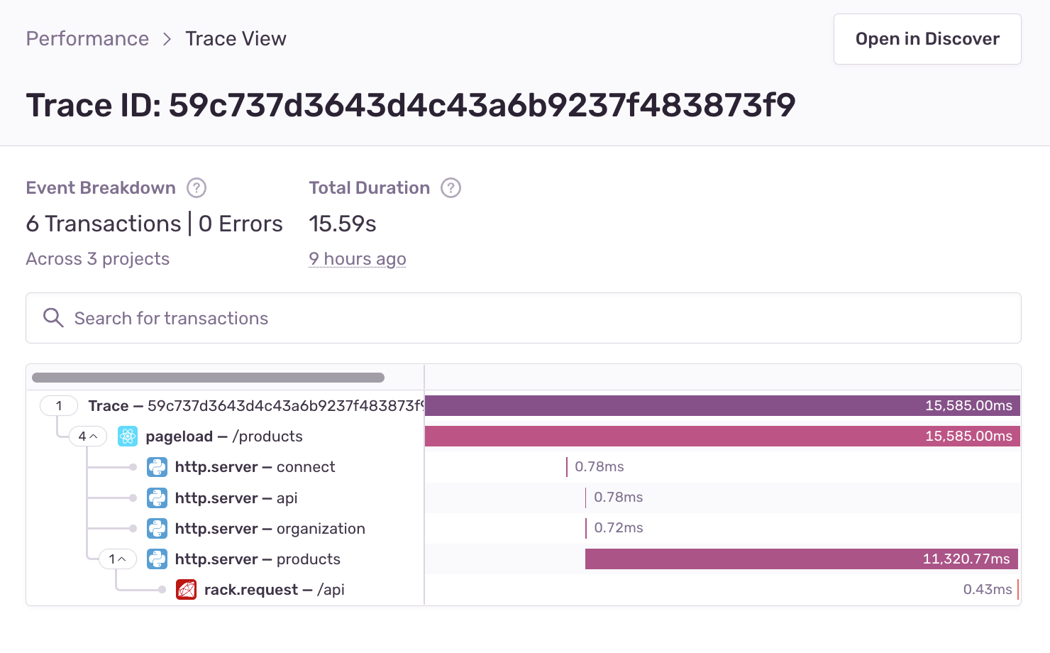A transaction represents a single instance of a service being called to support an operation you want to measure or track (e.g. page load, page navigation, an API call or asynchronous task). Individual operations are called spans. Poor-performing spans can impact latency resulting in a poor user experience or throughput issues impacting your site during peak times. Sentry’s distributed tracing capabilities allow you to see how a slow span in one project is holding up a transaction in another project.