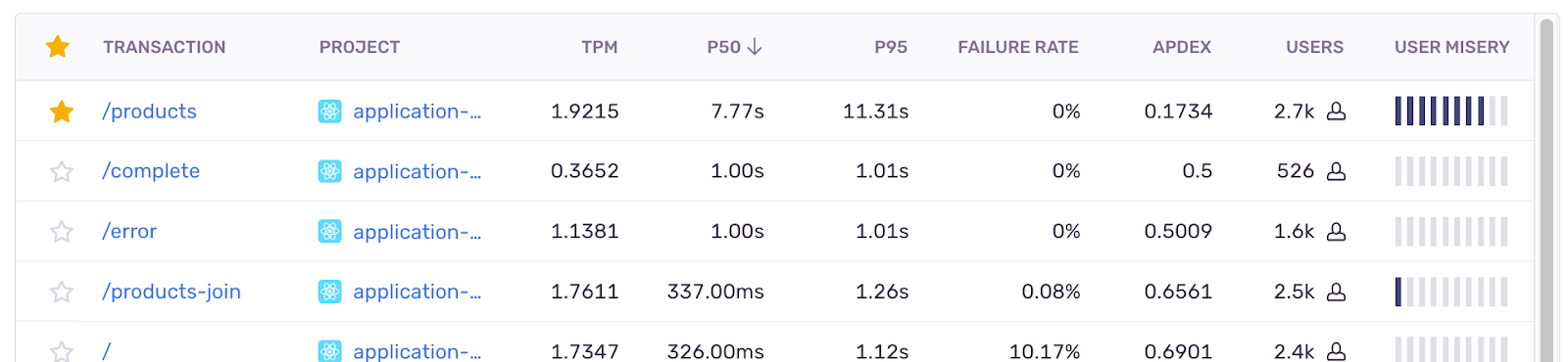 Let’s go back to that ecommerce example, turns out the frontend is built in React and the backend is using the Flask framework in Python. One day you notice that the product pages are loading slowly. You go to the Performance tab in Sentry and see the p50 for the /products page is over 7 seconds (yikes!).
