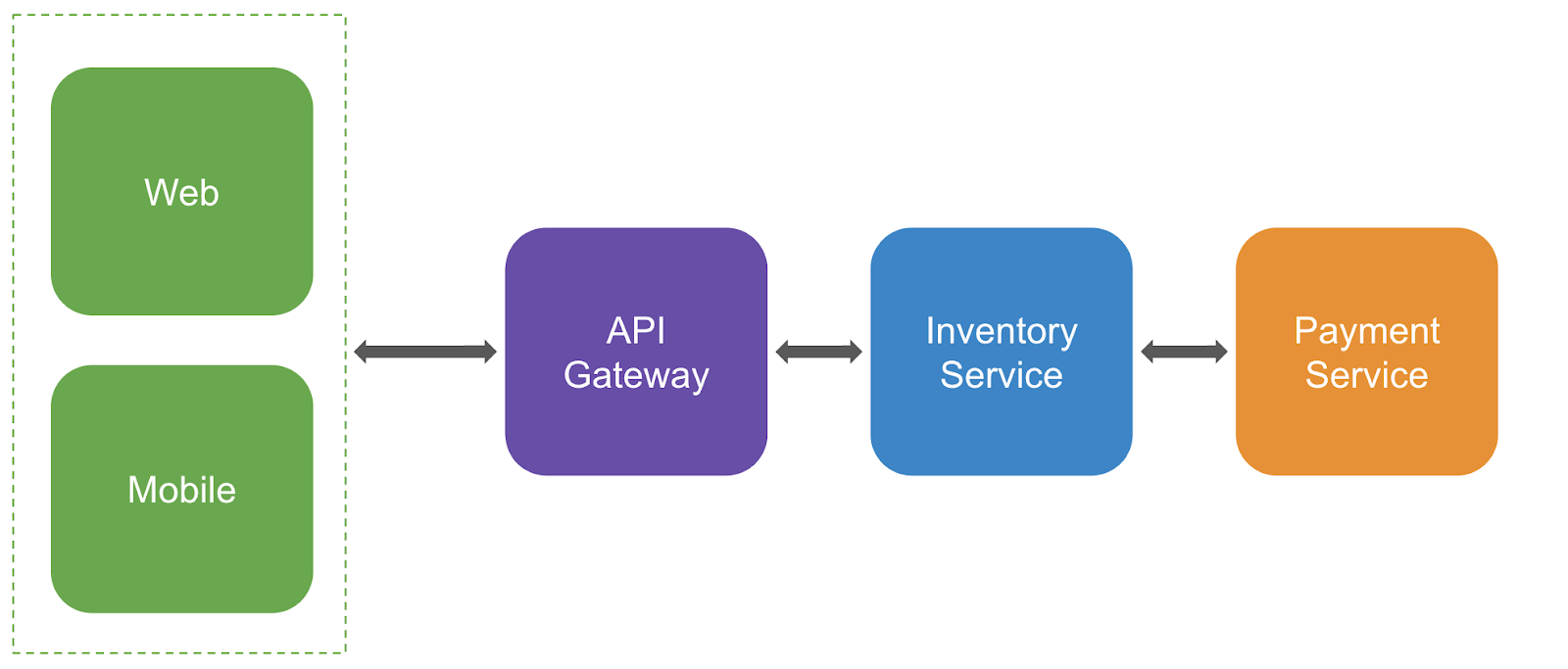 Frontend technologies, or clients, communicate with backend services, and those services talk to database servers or third-party services. Take an ecommerce company for example. This storefront could have a website and a mobile app, both of which talk to an API Gateway that routes information to the inventory service, and finally to the payment service.