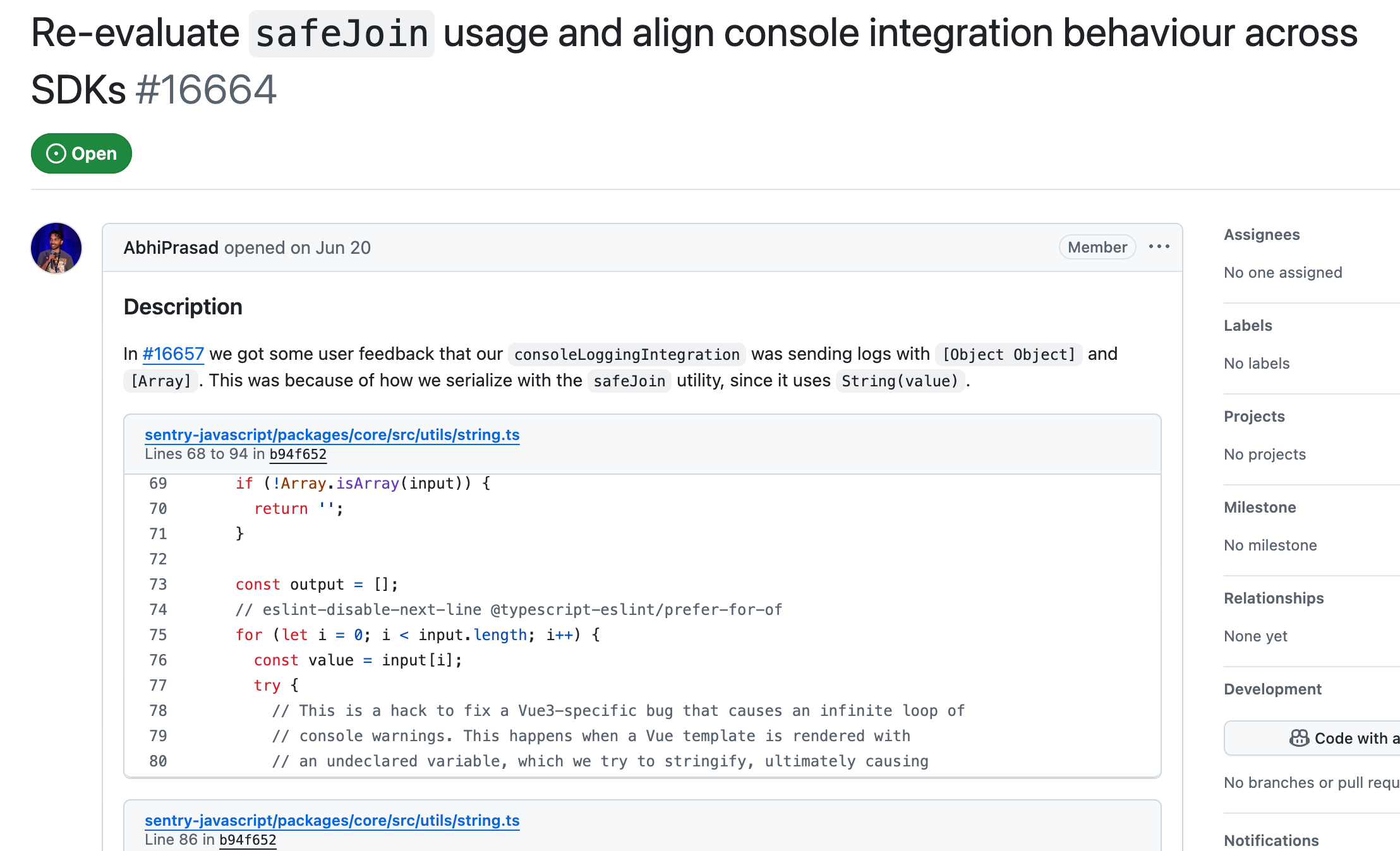 A JavaScript SDK issue where serialization of certain objects were causing log messages to not render properly. This problem was due to how we were concatenating strings together in the JavaScript SDK to generate logs created via our console instrumentation. The fix was simple, but it was a reminder that it’s easy to let
