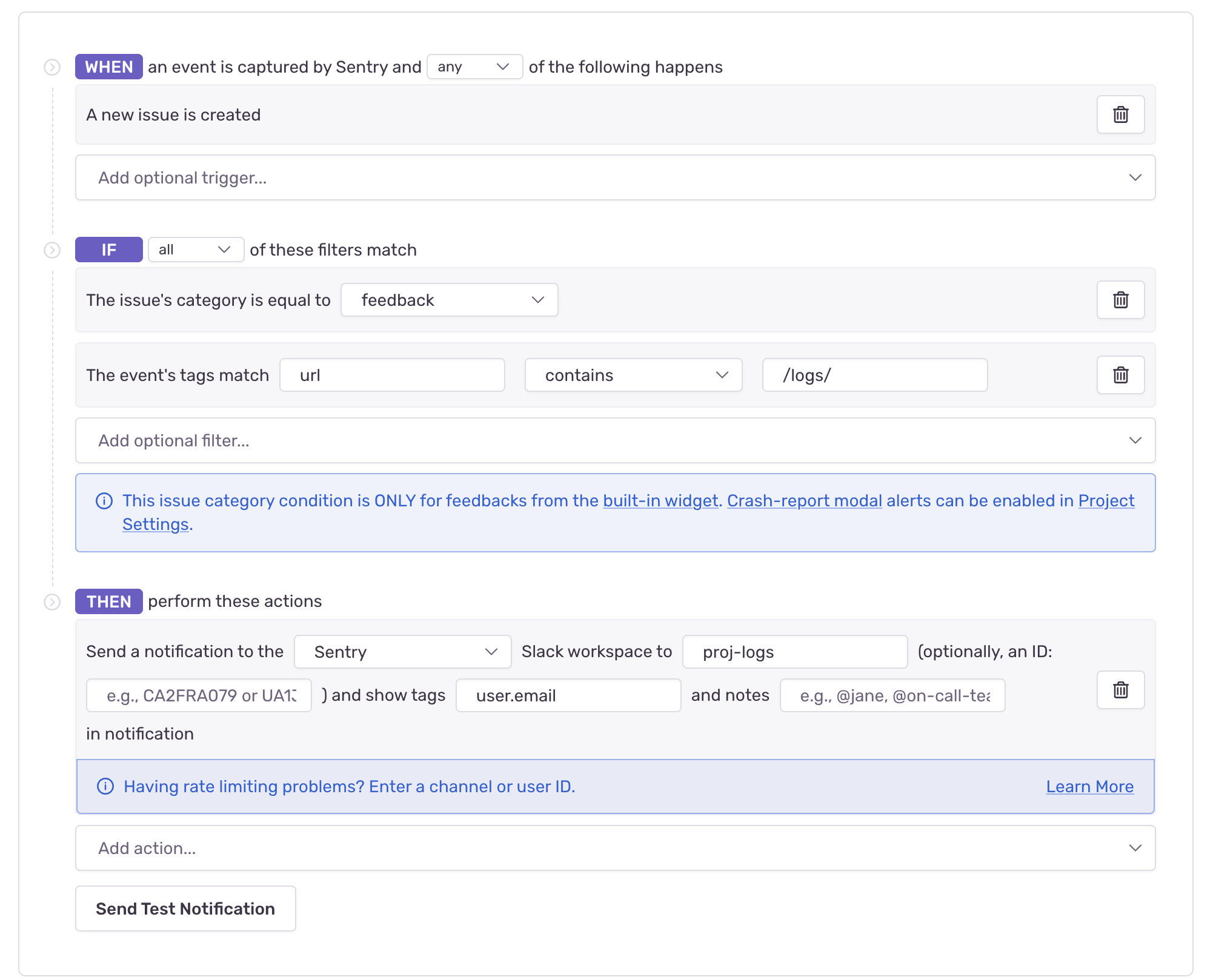 feedback.source:new-checkout-screenorfeedback.type:negativeorganizes feedback by feature and sentiment, enabling fast triage.Route alerts in real time: Feedback with certain tags or URLs can flow directly into the appropriate channel via alert rules —allowing engineers to see, respond, or fix issues ASAP. For Logs, feedbacks submitted on the