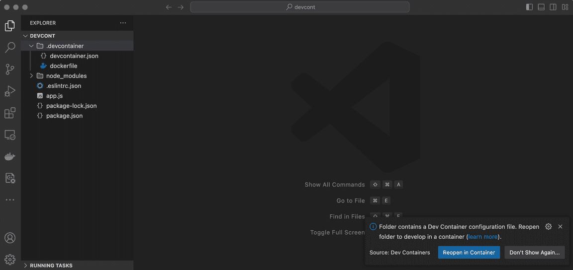 When you open this folder in VS Code, a notification should ask you to reopen in a container. Click the button to confirm.
