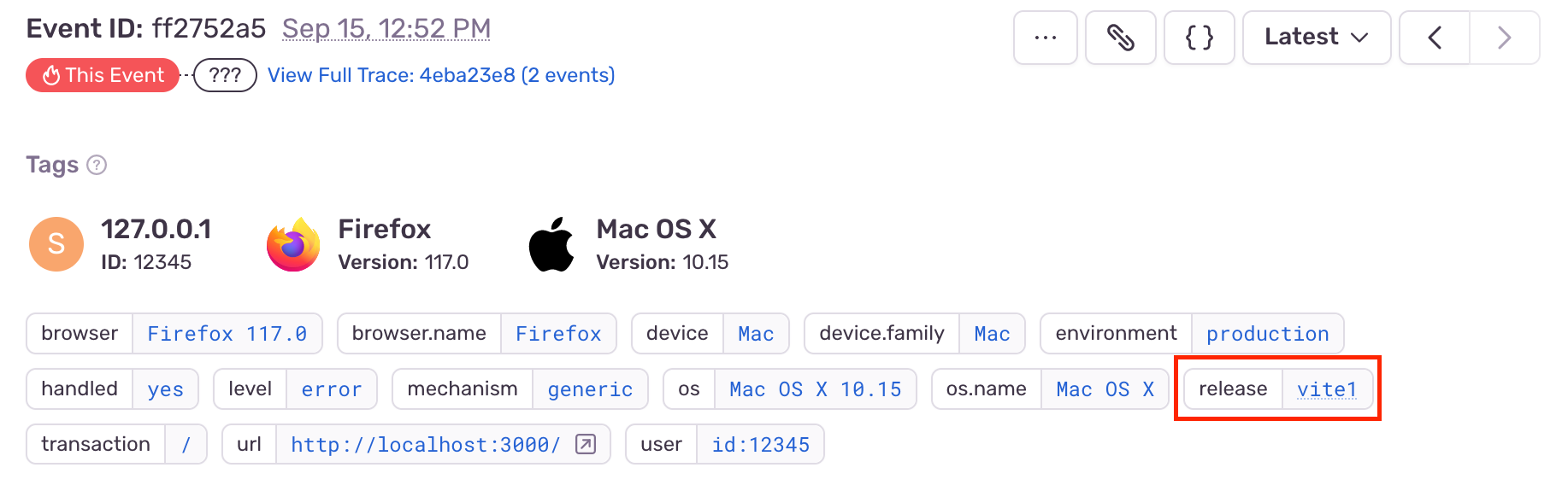 Check for the release and dist tags in the event JSON file, at the top of the Issue Details page, or on your project’s Source Maps page.