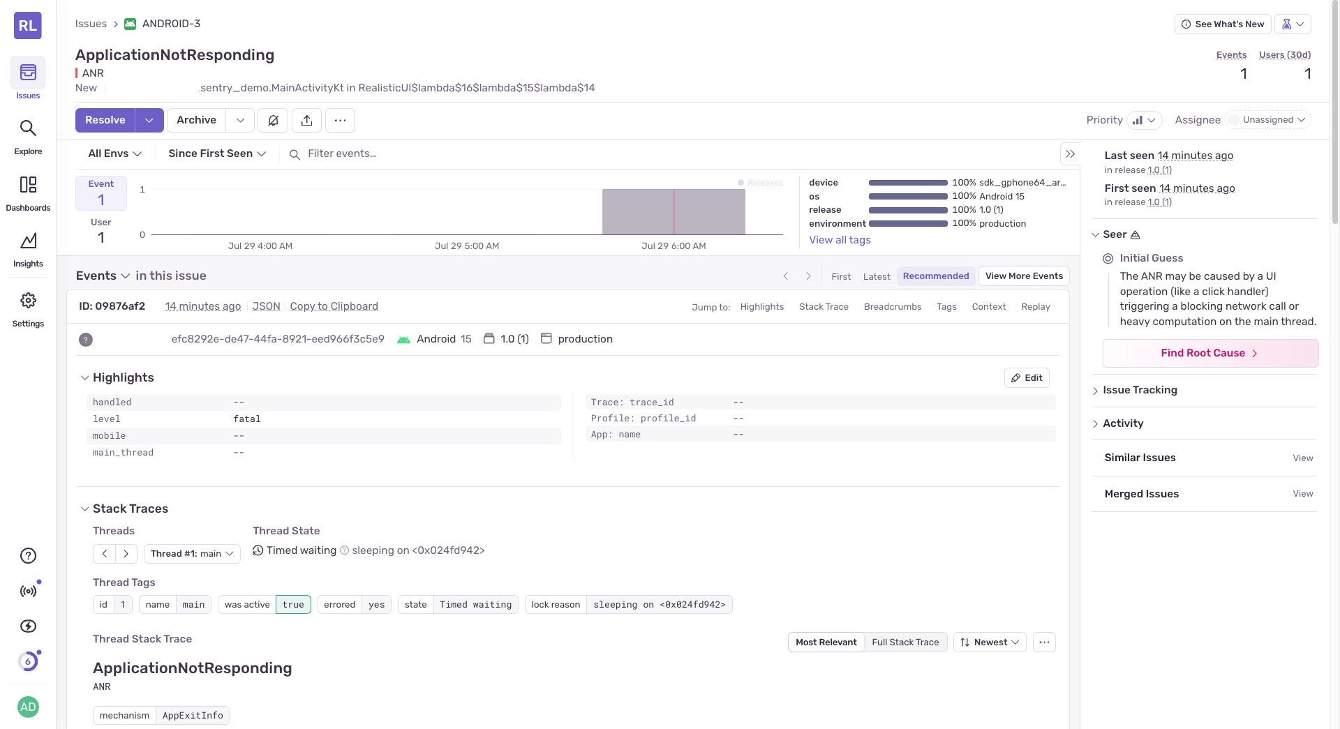 The good news is that Sentry automatically detects ANRs without requiring manual implementation. The Sentry Android SDK, for example, automatically captures ANR events using multiple detection methods: