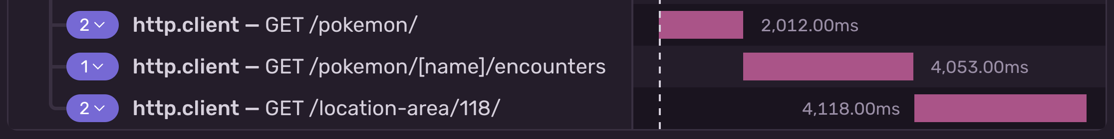 We can clearly see which ones are suspiciously slow. Clicking on one of them will show us the Trace View screen where we can see all of the spans. If we zoom in and look closely to the http.client spans, we can see a waterfall: